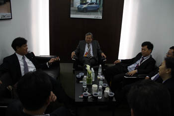 上海國際車展上,華菱重卡董事長劉漢如(右一)和三菱自動車工業(yè)株式會社社長益子修(左一)會晤,尋求合作機(jī)會和未來共同發(fā)展空間。陳曉/攝 |