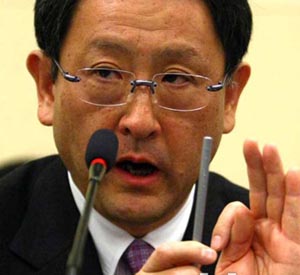 | 豐田汽車公司社長豐田章男(前中)在上海車展向中方嘉賓介紹豐田展車。記者 陳建力/攝 |