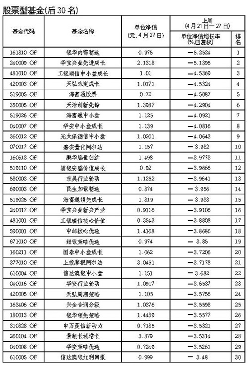銀華基金公司旗下,2009年下半年上市的銀華內(nèi)需精選以-5.25%的凈值增長率成為本周(4月21日-27日)股票型基金收益倒數(shù)第一,其今年年漲幅為-16.91%。