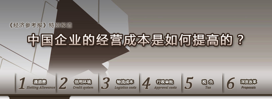當(dāng)前,在全球競爭越來越激烈的情況下,中國企業(yè)面臨的壓力日益增大,其中,企業(yè)經(jīng)營成本高企是造成這種壓力的一個(gè)重要原因!督(jīng)濟(jì)參考報(bào)》記者近日深入調(diào)研發(fā)現(xiàn),在原材料價(jià)格上漲,人力成本升高等外部因素之外,巨額通道費(fèi)用、天價(jià)路橋費(fèi)、愈演愈烈的“蓋章成本”等壓力正疊加作用于企業(yè),令其成本驟增、利潤大幅縮水。通過對中國企業(yè)經(jīng)營成本增加圖景的鳥瞰,我們可以清晰地感受到:市場經(jīng)濟(jì)在中國發(fā)展至今,其內(nèi)在機(jī)制迫切需要再一次的優(yōu)化與升級。從今天起,本報(bào)深度版將以“中國企業(yè)的經(jīng)營成本是如何提高的?”為主題,刊登一組分析報(bào)道,敬請讀者關(guān)注。 |