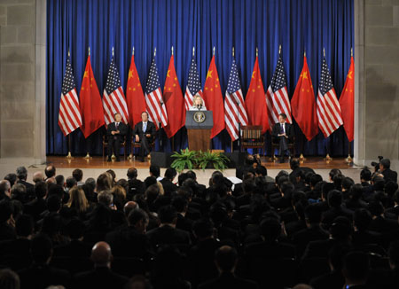 5月9日,第三輪中美戰(zhàn)略與經(jīng)濟(jì)對話聯(lián)合開幕式在美國首都華盛頓舉行。中國國家主席胡錦濤特別代表、國務(wù)院副總理王岐山在開幕式上表示,圍繞確保經(jīng)濟(jì)復(fù)蘇,中美之間政策措施既有互補(bǔ),亦有碰撞,但合作的利益遠(yuǎn)遠(yuǎn)大于競爭的分歧。