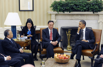 5月9日,美國總統(tǒng)奧巴馬在華盛頓白宮會見正在當?shù)爻鱿谌喼忻缿?zhàn)略與經(jīng)濟對話的中國國家主席胡錦濤特別代表國務(wù)院副總理王岐山、國務(wù)委員戴秉國。新華社記者