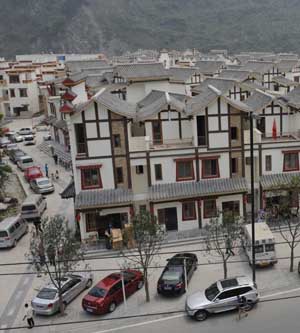 新建的映秀鎮(zhèn)街道上停滿了自駕游客的汽車。新華社記者