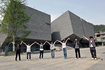 青川縣關(guān)莊中學(xué)的學(xué)生在青川縣地震博物館前拉起“人鏈墻”。新華社記者