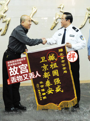 故宮竊案破獲之后,5月13日,故宮博物院副院長(zhǎng)紀(jì)天斌等相關(guān)負(fù)責(zé)人來到北京市公安局贈(zèng)送錦旗,對(duì)市公安局迅速破獲故宮博物院展品被盜案表示感謝。這本來是一件“例行公事”,誰料只有10字感謝語(yǔ)的錦旗上居然還出現(xiàn)了一個(gè)錯(cuò)別字,導(dǎo)致意思完全相反,引來眾多網(wǎng)友“圍觀”。展品竊案和建福宮成私人會(huì)所余波未平,故宮再度陷入爭(zhēng)議漩渦。 當(dāng)天,由北京市公安局局長(zhǎng)傅政華親自接過的一面錦旗上,上書10個(gè)大字:撼祖國(guó)強(qiáng)盛