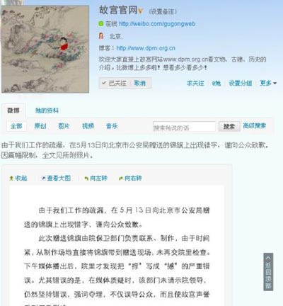 故宮博物院16日通過微博就其向北京市公安局贈(zèng)送錦旗出現(xiàn)錯(cuò)字一事,向公眾道歉。故宮在這份聲明中說,此次贈(zèng)送錦旗由保衛(wèi)部門負(fù)責(zé)聯(lián)系、制作,贈(zèng)送前未“交院里檢查”。在媒體質(zhì)疑時(shí),該部門未請(qǐng)示院領(lǐng)導(dǎo),仍然堅(jiān)持錯(cuò)誤,強(qiáng)詞奪理,不僅誤導(dǎo)公眾,而且使故宮聲譽(yù)受到嚴(yán)重影響。 故宮博物院日前向北京市公安局贈(zèng)送錦旗,感謝警方迅速破獲展品被盜案。而一面寫有“撼祖國強(qiáng)盛,衛(wèi)京都泰安”的錦旗,引起網(wǎng)友質(zhì)疑,稱“撼”為錯(cuò)別字,正確用字應(yīng)為“捍”。面對(duì)質(zhì)疑,接受媒體采訪的故宮相關(guān)負(fù)責(zé)人解釋說:“‘撼’字沒錯(cuò),顯得厚重。跟‘撼山易,撼解放軍難’中‘撼’字使用是一樣的!贝伺e引發(fā)外界更大的質(zhì)疑,有語言文字方面的專家表示,“撼”字在這里肯定是錯(cuò)別字。 16日,故宮博物院通過微博對(duì)外發(fā)布聲明,就此事向公眾道歉。 故宮方面的聲明全文如下。 由于我們工作的疏漏,在5月13日向北京市公安局贈(zèng)送的錦旗上出現(xiàn)錯(cuò)別字,謹(jǐn)向公眾致歉。 此次贈(zèng)送錦旗由院保衛(wèi)部門負(fù)責(zé)聯(lián)系、制作,由于時(shí)間緊,從制作場(chǎng)地直接將錦旗帶到贈(zèng)送現(xiàn)場(chǎng),未再交院里檢查。下午媒體播出后,院里才發(fā)現(xiàn)把“捍”寫成“撼”的嚴(yán)重錯(cuò)誤。尤其錯(cuò)誤的是,在媒體質(zhì)疑時(shí),該部門未請(qǐng)示院領(lǐng)導(dǎo),仍然堅(jiān)持錯(cuò)誤,強(qiáng)詞奪理,不僅誤導(dǎo)公眾,而且使故宮聲譽(yù)受到嚴(yán)重影響。 事情發(fā)生后,院里即時(shí)進(jìn)行認(rèn)真調(diào)查,給予當(dāng)事人嚴(yán)肅的批評(píng)教育,并采取了補(bǔ)救措施。故宮博物院現(xiàn)正組織全院各部門舉一反三,吸取教訓(xùn),堵塞漏洞,增強(qiáng)工作責(zé)任心,進(jìn)行全面整改。