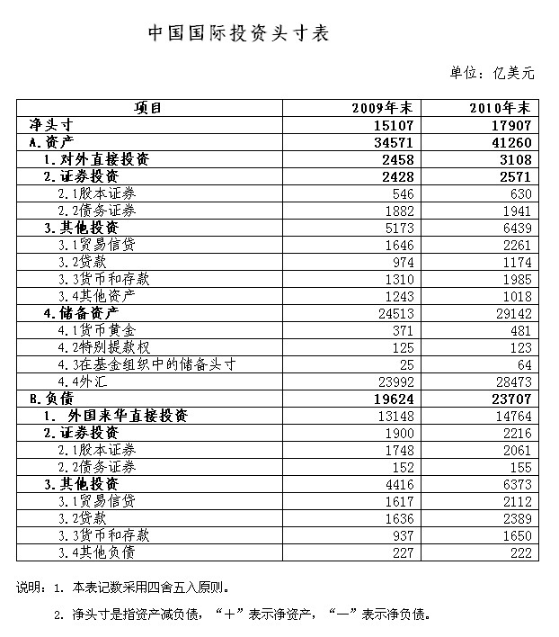 中國國際投資頭寸表是反映特定時點(diǎn)上我國(不含中國香港、澳門和臺灣,下同)對世界其他國家或地區(qū)金融資產(chǎn)和負(fù)債存量的統(tǒng)計報表。