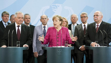 5月30日,在德國首都柏林,德國總理默克爾(中)在接受能源供應(yīng)安全倫理道德專家委員會(huì)遞交的《德國的能源轉(zhuǎn)折》報(bào)告書前發(fā)表講話。