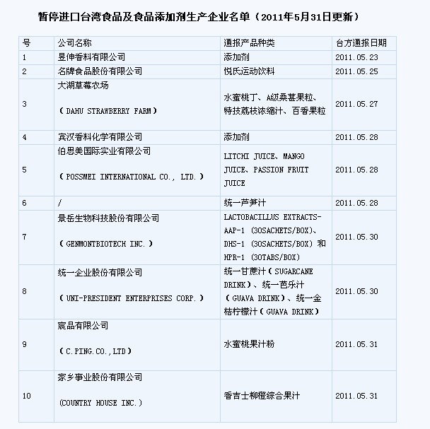 一、自2011年6月1日起,暫停進(jìn)口臺(tái)灣方面通報(bào)的問題產(chǎn)品生產(chǎn)企業(yè)生產(chǎn)的運(yùn)動(dòng)飲料、果汁、茶飲料、果醬果漿、膠錠粉類產(chǎn)品和食品添加劑。