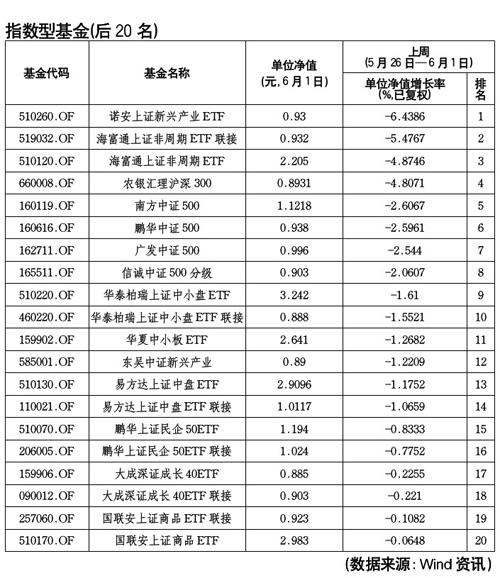 諾安基金管理有限公司旗下的,2011年4月成立的諾安上證新興產(chǎn)業(yè)以-6.44%的凈值增長(zhǎng)率成為本周(5月26日-6月1日)指數(shù)型基金收益倒數(shù)第一,其今年以來年漲幅為-7.7%。