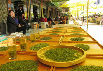 峨橋茶市始自明末清初,歷史悠久,素有“江南第一茶市”美譽(yù)。峨橋人更是以“買全國(guó)茶,賣全國(guó)茶”聞名。記者走進(jìn)寫有“江南第一茶市”的高大的仿古門樓,只見前面茶市一排排大黃油布傘密密麻麻,一眼望不到頭。大黃傘下,人頭攢動(dòng),熙熙攘攘,買茶的人群絡(luò)繹不絕,品茶的、論茶的、談價(jià)的、包裝的……茶市一片熱鬧繁忙景象。