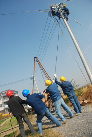 余杭供電局大力開展新農(nóng)村電氣化建設,讓農(nóng)民與居民享受一樣的用電待遇。圖為余杭供電所農(nóng)電班的員工們正在為新豎起的電桿拉線。姚學恒