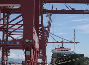 2010年8月26日,韓國集裝箱班輪“中海向珠”成功靠泊梅山港區(qū)1號泊位,標(biāo)志著梅山保稅港區(qū)10條韓國航線正式開通,這也是寧波梅山港區(qū)靠泊的首艘集裝箱班輪。資料照片 |