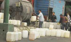 糧油批發(fā)市場是“地溝油”的另外一個(gè)重要去向。知情人告訴記者,加工窩點(diǎn)把油用油罐車運(yùn)到批發(fā)市場后,批發(fā)市場的商戶再把油分裝到一個(gè)個(gè)幾十斤裝的白色汽油桶里。這些散裝油桶一般沒有任何標(biāo)識(shí)。