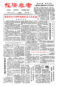 1984年1月7日,《經(jīng)濟(jì)參考報(bào)》在頭版頭條位置刊發(fā)了本報(bào)評(píng)論員文章《建設(shè)具有中國特色的社會(huì)主義農(nóng)業(yè)》,充分肯定了以聯(lián)產(chǎn)承包制為代表的農(nóng)村改革,指出這是一種很有意義的嘗試,經(jīng)過幾年的實(shí)踐考驗(yàn),證明它是成功的。