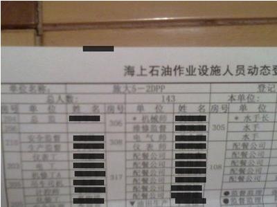 如果按照這張圖片顯示的住宿名單來看,這個海上平臺無疑存在超員的現(xiàn)象,該網(wǎng)友稱,“一個有2艘救生艇的平臺,一共可以乘坐120人,怎么有143人在平臺上”。他表示,如果海面發(fā)生漏油火災,那么剩下的23個人將得不到有效救援。他說,如果剩下的23人不乘坐救生艇,而是乘坐非密閉的救生筏,那么在海面有火有毒的環(huán)境下,這些人的性命堪憂。