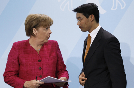 德國總理安格拉·默克爾領(lǐng)導(dǎo)的中右執(zhí)政聯(lián)盟內(nèi)部就降低稅收達(dá)成共識,定于7月6日提交內(nèi)閣審議,下一個(gè)議會選舉年著手落實(shí)。德國國際通訊社(DAPD)7月3日獲得一份備忘錄,涉及默克爾及其執(zhí)政聯(lián)盟伙伴的商議結(jié)果,但沒有提及具體減稅金額。 圖為默克爾(左)與德國經(jīng)濟(jì)部長菲利普·勒斯勒爾2011年5月16日在柏林出席新聞發(fā)布會的資料照片。