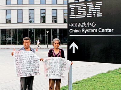 炎炎烈日將地面烤得發(fā)燙,老人卻毫不懈怠地守護著鋪在大廈臺階上的幾張發(fā)黃的硬殼紙,紙上布滿了密密麻麻的文字,字跡顯得有些凌亂不清,但從中卻似乎能感受到一種憤懣的情緒,尤其是“IBM”三個字力透紙背。