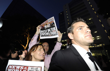 《世界新聞報》可能非法取得犯罪受害人——包括一名被綁架而后被撕票的13歲女童——語音郵件信息的事情被揭露,在英國引起公憤,也讓這家報紙陷入危機(jī),外界原以為該報只關(guān)注名人和其他聲名顯赫人物的動向。(路透社)