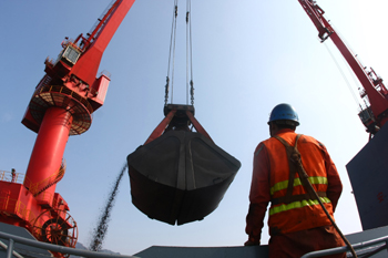 江蘇連云港煤碼頭正在卸載進(jìn)口的煤炭。新華社發(fā) |