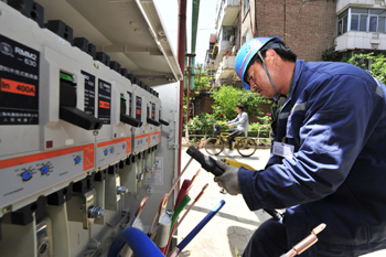 據(jù)預(yù)測,天津市今夏最大用電負荷將出現(xiàn)在7月下旬或8月上旬,最大電力缺口可達150萬千瓦。圖為國家電網(wǎng)天津城西供電分公司配電施工人員在南開區(qū)府湖里居民小區(qū)進行低壓開關(guān)柜升級改造。新華社發(fā)(吳宣述攝) |
