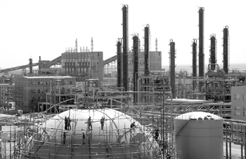 新疆哈密工人在廣匯120萬噸甲醇/80萬噸二甲醚、5億立方米煤制天然氣項(xiàng)目工地上施工。資料照片 |