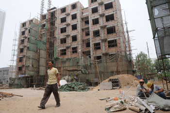 因?yàn)榇嬖趪?yán)重的質(zhì)量問題和安全隱患,鄭州市“匯景嘉園”小區(qū)一處拆遷安置小區(qū)8棟剛封頂2個月的多層樓房,開始全部拆除、重新建設(shè)。有關(guān)人員稱主要是工程所用的新材料煤矸石磚為不合格產(chǎn)品。拆除的“匯景嘉園”是鄭州市為解決市內(nèi)交通問題,決定建設(shè)京沙快速路,為拆遷居民建造的安置房。這個項目由鄭州地產(chǎn)長城房地產(chǎn)經(jīng)營開發(fā)有限公司建設(shè),河南勝達(dá)建筑工程有限公司施工,主體工程于今年3月動工,到5月底8棟樓房全部封頂。圖為一名工人從正在拆除的小區(qū)里走過。
