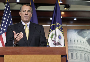 7月22日,在美國(guó)華盛頓國(guó)會(huì)山,美國(guó)眾議院議長(zhǎng)約翰·博納就債務(wù)限額問(wèn)題發(fā)表講話。 博納在稍后的記者會(huì)上批評(píng)奧巴馬,稱后者要求將未來(lái)10年額外增稅4000億美元,且拒絕增加社保開(kāi)支削減規(guī)模,要為這輪談判告吹負(fù)責(zé)。新華社/路透 |