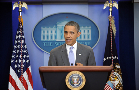7月31日,在美國(guó)華盛頓白宮,奧巴馬在記者會(huì)上宣布美國(guó)國(guó)會(huì)兩黨已就提高債務(wù)上限達(dá)成一致。 分析認(rèn)為,如果這份協(xié)議未來(lái)幾天在國(guó)會(huì)兩院順利獲得通過(guò),備受全球關(guān)注的美國(guó)債務(wù)違約警報(bào)將暫時(shí)得以解除,但美國(guó)長(zhǎng)期債務(wù)形勢(shì)依然嚴(yán)峻。