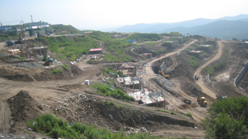 8月3日,《經(jīng)濟(jì)參考報(bào)》記者登上綏芬河市區(qū)東南一公里的前山要塞風(fēng)景區(qū),這里已經(jīng)成為粵水電房地產(chǎn)項(xiàng)目“新都綏園”一期建設(shè)工地。風(fēng)景區(qū)內(nèi)偌大的建設(shè)工地上,挖掘機(jī)、推土機(jī)和運(yùn)輸車輛穿梭往來、塵土飛揚(yáng),山體被挖得溝壑縱橫。十幾幢獨(dú)棟別墅已完成主體框架結(jié)構(gòu),部分已經(jīng)封頂,多處正在進(jìn)行基坑開挖。