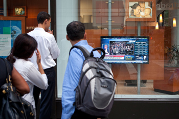 在美國紐約,幾名行人在街頭觀看美國眾議院投票通過提高美國債務上限和削減赤字法案的電視新聞報道。新華社/法新 |