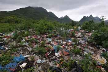 在廣西陽(yáng)朔縣興坪鎮(zhèn)西塘黃花坪垃圾填埋處理場(chǎng),簡(jiǎn)單處理的垃圾在青山綠草間格外扎眼。資料照片 |