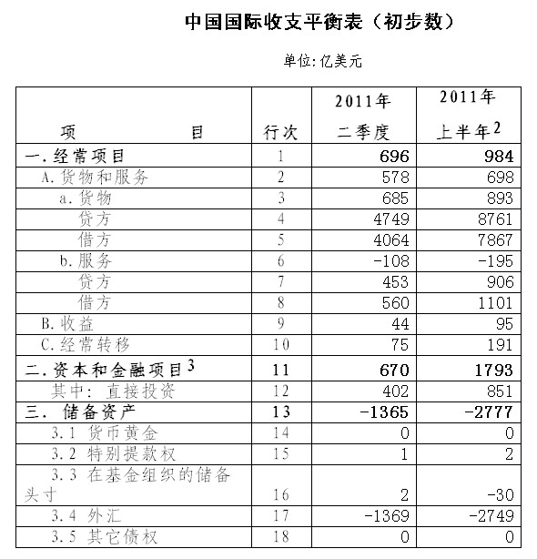 日前,國(guó)家外匯管理局公布2011年二季度及上半年我國(guó)國(guó)際收支平衡表初步數(shù)據(jù)。