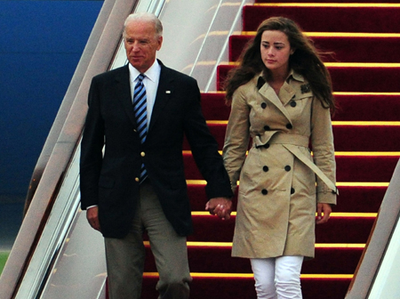17日,美國副總統(tǒng)拜登抵達北京,開始對中國進行為期6天的正式訪問。圖為拜登和他的孫女走下飛機。 據(jù)法新社報道,時值美國國債評級遭遇歷史性下調(diào)之際,拜登此行目的在于修復美國的國家形象。 另據(jù)美國財政部副部長拉爾·布雷納德日前介紹,作為全程參與美債談判的白宮高官,拜登將向中方表明美國正采取有力措施處理債務問題。