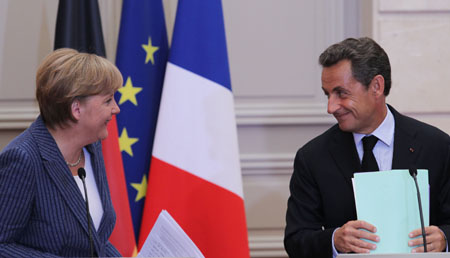 8月16日,法國總統(tǒng)薩科齊(右)與來訪的德國總理默克爾在總統(tǒng)府愛麗舍宮出席聯(lián)合記者招待會。 法國總統(tǒng)薩科齊和德國總理默克爾16日在巴黎表示,法德兩國將共同提出成立歐元區(qū)經(jīng)濟政府、成員國實施財政平衡政策、征收金融交易稅等建議,以加強歐元區(qū)經(jīng)濟治理,應對目前歐元區(qū)面臨的債務和經(jīng)濟增長危機。