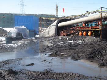 污水橫流的阜康氣煤有限公司二號井施工現(xiàn)場。記者 劉兵/攝 |