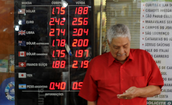 圖為巴西里約熱內(nèi)盧的一名行人經(jīng)過電子匯率顯示牌。法新社 |