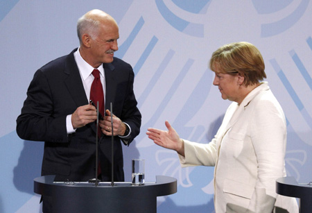 9月27日,在德國(guó)首都柏林的總理府,德國(guó)總理默克爾(右)和希臘總理帕潘德里歐在新聞發(fā)布會(huì)后交談。 當(dāng)天,德國(guó)總理默克爾在會(huì)見(jiàn)來(lái)訪的希臘總理帕潘德里歐時(shí)強(qiáng)調(diào),“我們希望在歐元區(qū)里有一個(gè)強(qiáng)大的希臘,為此德國(guó)愿意提供一切必要的幫助”。