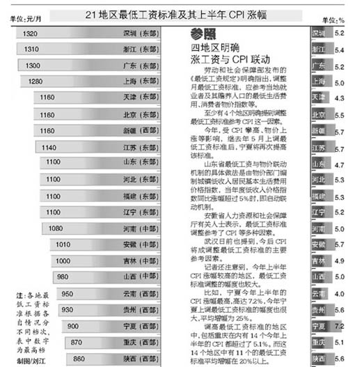 全國21地區(qū)已調(diào)高最低工資深圳最高重慶增幅居首21個地區(qū)最低工資標(biāo)準(zhǔn)及其上半年CPI漲幅