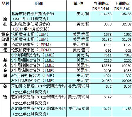 當(dāng)周國際金價獲得支撐,金價累計上漲2.9%。另外,投資者對歐元信心的增強(qiáng)導(dǎo)致美元走弱,而弱勢美元也有利于支撐貴金屬等大宗商品市場。芝加哥農(nóng)產(chǎn)品期貨價格當(dāng)周集體上揚(yáng)。據(jù)美國農(nóng)業(yè)部14日公布的出口報告,美國在截至10月6日一周共出口玉米134.4萬噸,高于此前市場預(yù)期,也是近5周以來第三周出口量超過100萬噸。同時,當(dāng)周美國出口小麥50萬噸,同樣高于此前分析師的預(yù)測。除以上因素外,大豆期貨價格還受到能源價格大漲的影響而實現(xiàn)連續(xù)上行。