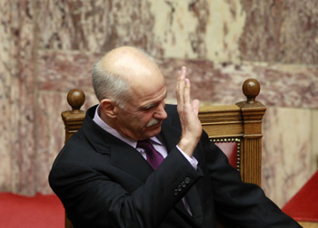 10月19日,希臘總理帕潘德里歐在希臘首都雅典舉行的議會(huì)上就新一輪緊縮措施法案表決。 希臘議會(huì)19日晚原則通過(guò)包括裁減國(guó)營(yíng)企業(yè)員工、增加房產(chǎn)稅等內(nèi)容的新一輪緊縮措施法案。議會(huì)將于20日對(duì)該法案進(jìn)行最終表決。當(dāng)天早些時(shí)候,約10萬(wàn)名民眾在雅典市中心的憲法廣場(chǎng)舉行示威,反對(duì)新一輪緊縮措施。