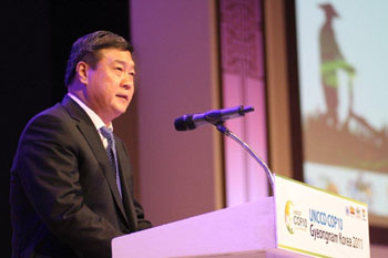 王文彪在聯(lián)合國(guó)防治荒漠化公約第十次締約國(guó)會(huì)議上做主旨演講。資料照片 |