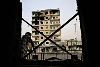 6月7日,在利比亞第三大城市利比亞米蘇拉塔,一名男子站在被損毀房屋的陽臺上,滿目是傷痕累累的建筑。記者 才揚
