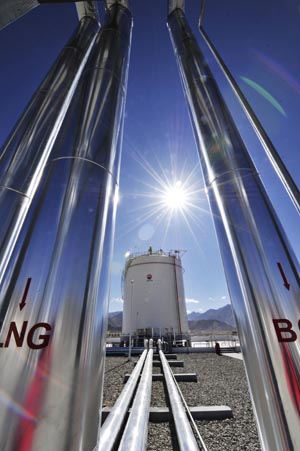 西藏拉薩天然氣站的液化天然氣儲(chǔ)罐和輸送管道。記者