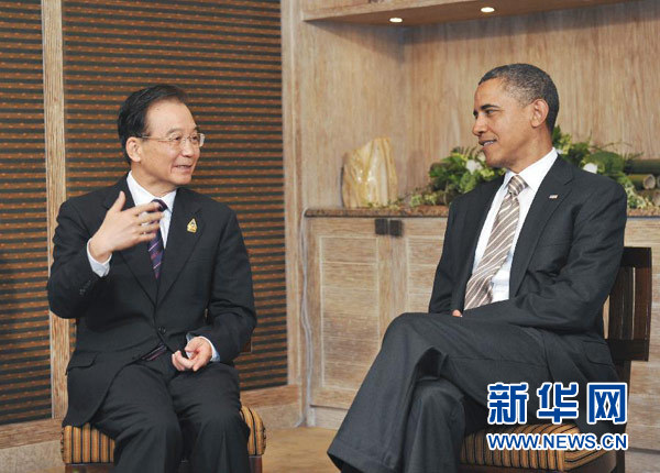 11月19日,中國國務院總理溫家寶在印度尼西亞巴厘島會見美國總統(tǒng)奧巴馬。