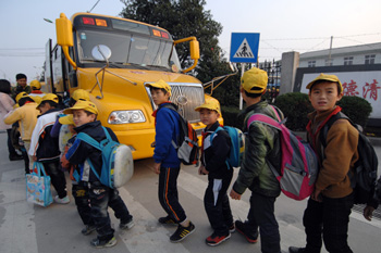 浙江德清縣學(xué)生成為“校車(chē)伴我上學(xué)路”的嘗鮮者。11月21日,育才學(xué)校的小學(xué)生們放學(xué)后排隊(duì)前往自己乘坐的校車(chē)。據(jù)了解,德清縣設(shè)立了每年400萬(wàn)的學(xué)生接送營(yíng)運(yùn)補(bǔ)貼專(zhuān)項(xiàng)資金,用于校車(chē)公司的運(yùn)行補(bǔ)貼,學(xué)生每人每次乘車(chē)只需支付一元錢(qián),貧困學(xué)生免費(fèi)。記者