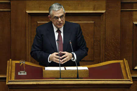 希臘議會7日凌晨通過了旨在擺脫債務危機的2012年預算案。但一些分析人士擔心,由于希臘民眾對財政緊縮措施的承受能力已近極限,這份預算執(zhí)行起來的難度會非常大。 圖為希臘總理帕帕季莫斯在議會上發(fā)言。