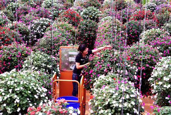 江陰市在寸土寸金的土地上劃定了200平方公里為不搞工業(yè)的“不開發(fā)區(qū)”,在限制建設(shè)區(qū)內(nèi),觀光農(nóng)業(yè)、生態(tài)農(nóng)業(yè)發(fā)展迅速。圖為嘉茂國際花鳥園的農(nóng)業(yè)工人修整懸在空中繁殖的反季節(jié)花卉三角梅。 |