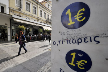 在希臘雅典街頭,一名婦女走過(guò)一家“一歐元”商店。新華社發(fā) |