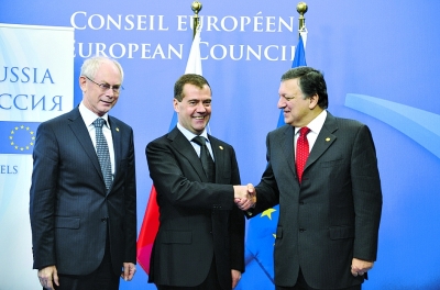 圖為15日第28屆歐盟—俄羅斯峰會在布魯塞爾舉行,歐洲理事會主席范龍佩(左)與歐盟委員會主席巴羅佐(右)歡迎俄羅斯總統(tǒng)梅德韋杰夫。